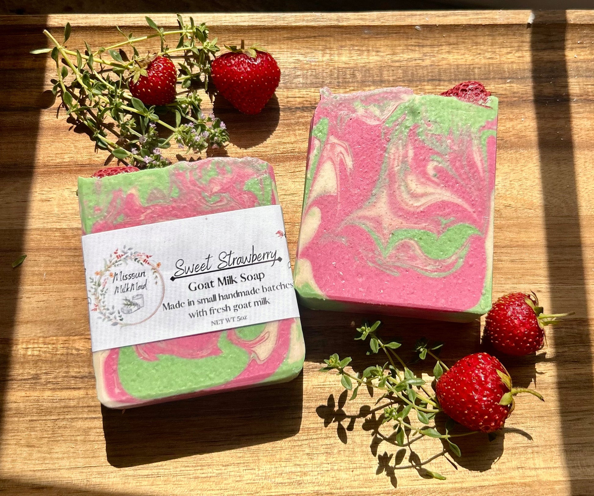 Enjoy a happy bath with our Sweet Strawberry Goat Milk Soap! With scents of fresh, ripe, sweet strawberry with just a hint of mixed berries! Perfect for summer but lovely any time of the year. this soap not only nourishes your skin with the goodness of goat milk, but also leaves behind a sweet and fresh scent. Say hello to soft, healthy skin and a boost of happiness every time you use it.🍓